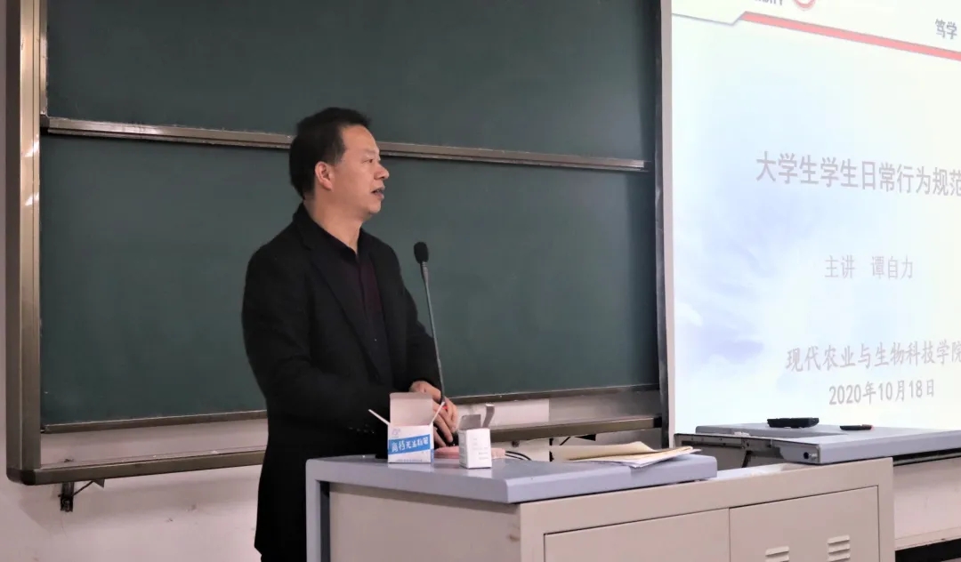 为加强新生入学后的组织纪律性,强化老员工日常行为规范,培养员工良好的生活、学习习惯,促进优良学风、校风建设。10月18日晚,BB贝博艾弗森在1203教室举行2020级新生日常行为规范教育主题讲座,谭自力担任主讲。