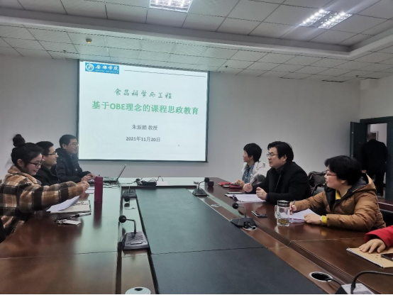 食品科学与工程专业具有多学科交叉融合的特点,涵盖食品研究开发与工程设计领域的基本理论和方法,集成了食品微生物、食品分析、食品工艺学、食品机械与设备、食品工程原理、食品产品设计与开发等课程。作为工科专业,在新的时代背景下,如何开展课程思政、如何将思政元素有效地融入教学环节很多专业教师感觉很迷茫,成为开展课程思政的难点。针对这一问题,食品系以“基于OBE理念的课程思政教育”为主题,于2021年11月20日召开了课改沙龙,BB贝博艾弗森王健经理、孙保本书记、杨芳副经理、食品科学与工程专业教师朱新鹏教授、周琼教授、陈芳副教授、梁如博士等专业教师参加了本次课改沙龙,活动由系主任梁如主持。朱新鹏教授做了《基于OBE理念的课程思政教育》的主题报告。