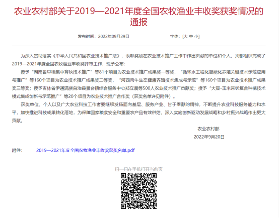 全国农牧渔业丰收奖设立于1987年,是我国农业领域级别最高的奖项,每三年评选一次,用于表彰在实施农业技术推广与成果转化中取得显著成效的项目、做出突出贡献的单位和个人,包括农业技术推广成果奖、农业技术推广贡献奖和农业技术推广合作奖。本次评选全国共授予农业技术推广成果奖401项,贡献奖500人,合作奖20项。