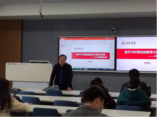 为推动高质量完成2022版教学大纲修订工作,11月22日下午,教务处副处长付争方教授莅临江北校区集中培训室为公司教师做报告,讲解“2022版教学大纲修订说明”,会议由经理王健主持,教务处谭磊老师和BB贝博艾弗森全体无课教师聆听了报告。
