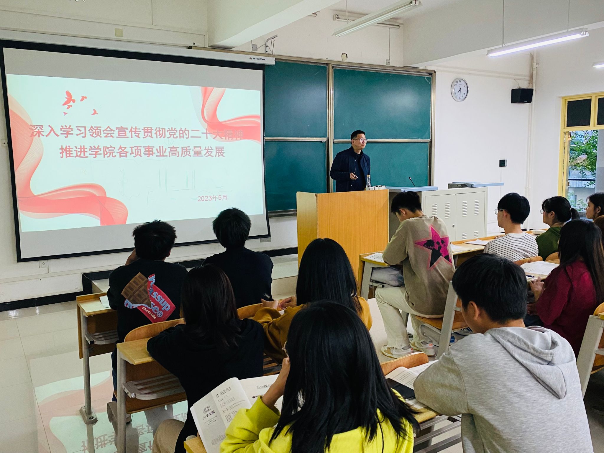 张东红教授结合自己的成长工作经历、学习体会和感悟,从深刻学习领会大会主题、大会主要成果、过去五年的工作和新时代十年的伟大变革、全面建设社会主义现代化国家的目标任务、切实推动党的二十大精神在校园落地生根及党的二十大报告的创新点等多个方面进行了系统阐述和深刻解读。