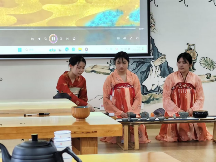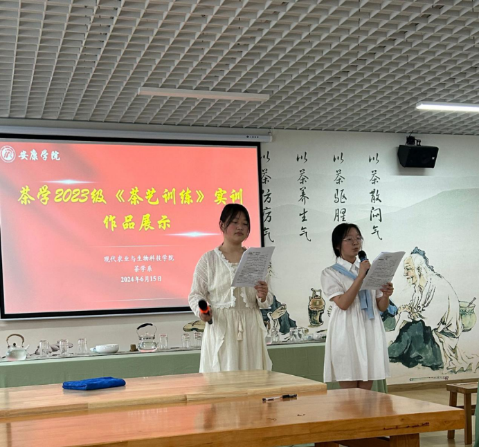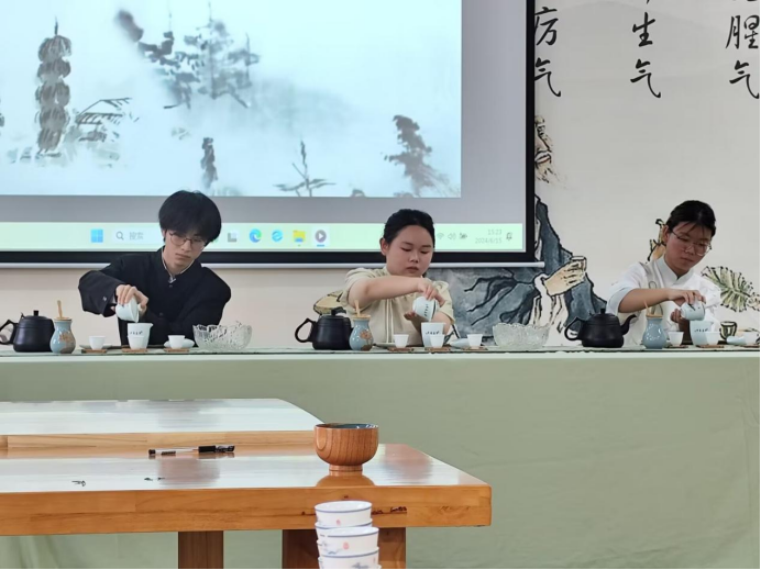 6月15日下午,茶学2023级《茶艺训练》课程成果展示在产教融合大楼茶艺室进行。茶学2023级全体同学参与展示,茶学系教师马瑛、袁月、尹旭超担任评委。活动由茶学22级员工田媛媛和夏雨主持。