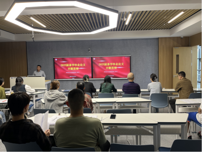 10月10日下午,在乡村振兴大楼培训研讨教室开展了2025届茶学专业毕业论文开题答辩,茶学系教师李冬花、谢满超、齐玉岗、马瑛、程晓梅、吴冲、袁月、常娜、贺心茹和尹旭超以及2021级茶学专业全体员工参加了此次汇报,会议由齐玉岗老师主持。