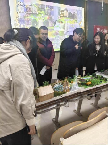 比赛拉开序幕,第一项便是一场视觉与智慧的盛宴——18个小组轮番上阵,每组紧握宝贵的3分钟,以满腔的热情和娴熟的展示技巧,将他们的创意火花呈现在众人面前。同学们站上属于自己的闪耀舞台,自信洋溢,仿佛每一位都是即将点亮设计界新星的魔法师。PPT成为了他们手中的魔法棒,每一页翻转都伴随着精彩纷呈的设计理念,将复杂的设计理念化为直观而生动的画面;而精心制作的模型,则是他们创意的实体化身,细腻到每一块材料的选择、每一处细节的雕琢,都无声地诉说着对完美的不懈追求。同学们通过这些精妙绝伦的辅助工具,不仅展现了他们在景观设计上的独到巧思,更将作品的每一个细节都放大至观众眼前,让人仿佛置身于他们所构想的美妙空间之中。